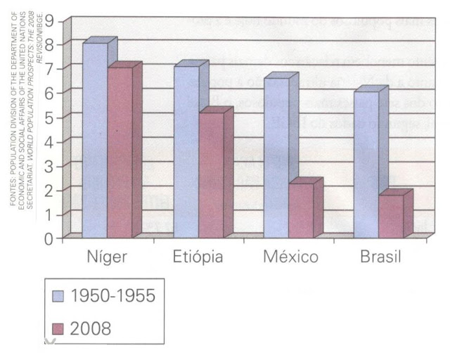 Taxas de Fecundidade no Níger/Etiópia/México/ Brasil para os períodos 1950-55 e 2008
